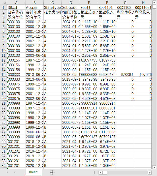 证券代码 会计年度 报表类型编码 招股开始日期 营业总收入 营业收入 利息净收入 利息收入 利息支出 已赚保费 保险业务收入 其中:分保费收入 减:分出保费 减:提取未到期责任准备金 手续费及佣金净收入 其中:代理买卖证券业务净收入 其中:证券承销业务净收入 其中:受托客户资产管理业务净收入 手续费及佣金收入 手续费及佣金支出 其他业务收入 营业总成本 营业成本 退保金 赔付支出净额 赔付支出 减:摊回赔付支出 提取保险责任准备金净额 提取保险责任准备金 减:摊回保险责任准备金 保单红利支出 分保费用 保险业务手续费及佣金支出 营业税金及附加 业务及管理费 减:摊回分保费用 销售费用 管理费用 财务费用 资产减值损失 其他业务成本 公允价值变动收益 投资收益 其中:对联营企业和合营企业的投资收益 汇兑收益 其他业务利润 营业利润 营业外收入 营业外支出 其中:非流动资产处置净损益 利润总额 所得税费用 未确认的投资损失 影响净利润的其他项目 净利润 归属于母公司所有者的净利润 少数股东损益 基本每股收益 稀释每股收益 其他综合收益(损失) 综合收益总额 归属于母公司所有者的综合收益总额 归属于少数股东的综合收益总额