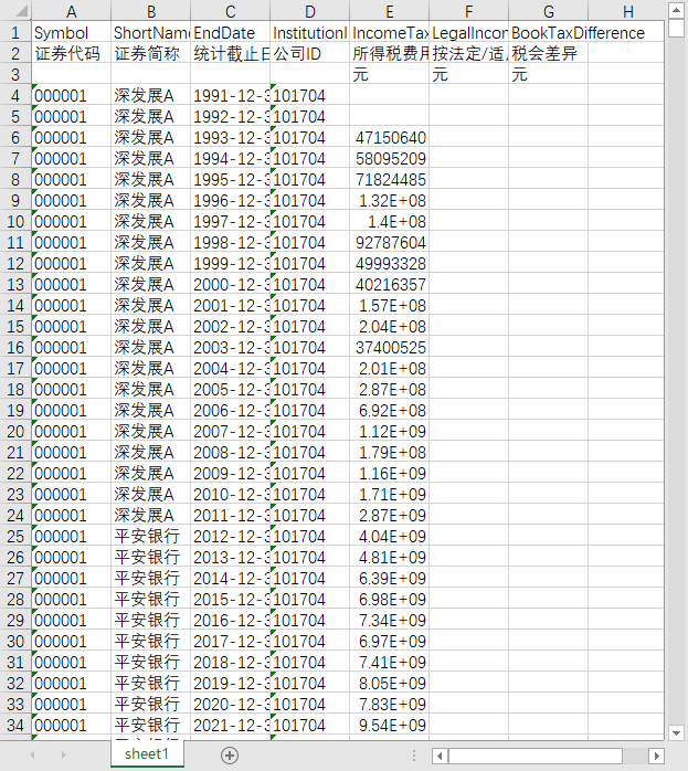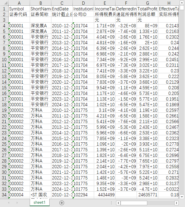 证券代码 证券简称 统计截止日期 公司ID 所得税费用 递延所得税费用 利润总额 实际所得税率 名义所得税率 第一类避税指标(ETR) 第一类避税程度(RATE) 第一类避税程度(LRATE) 会税差异(BTD) 税务风险指标1