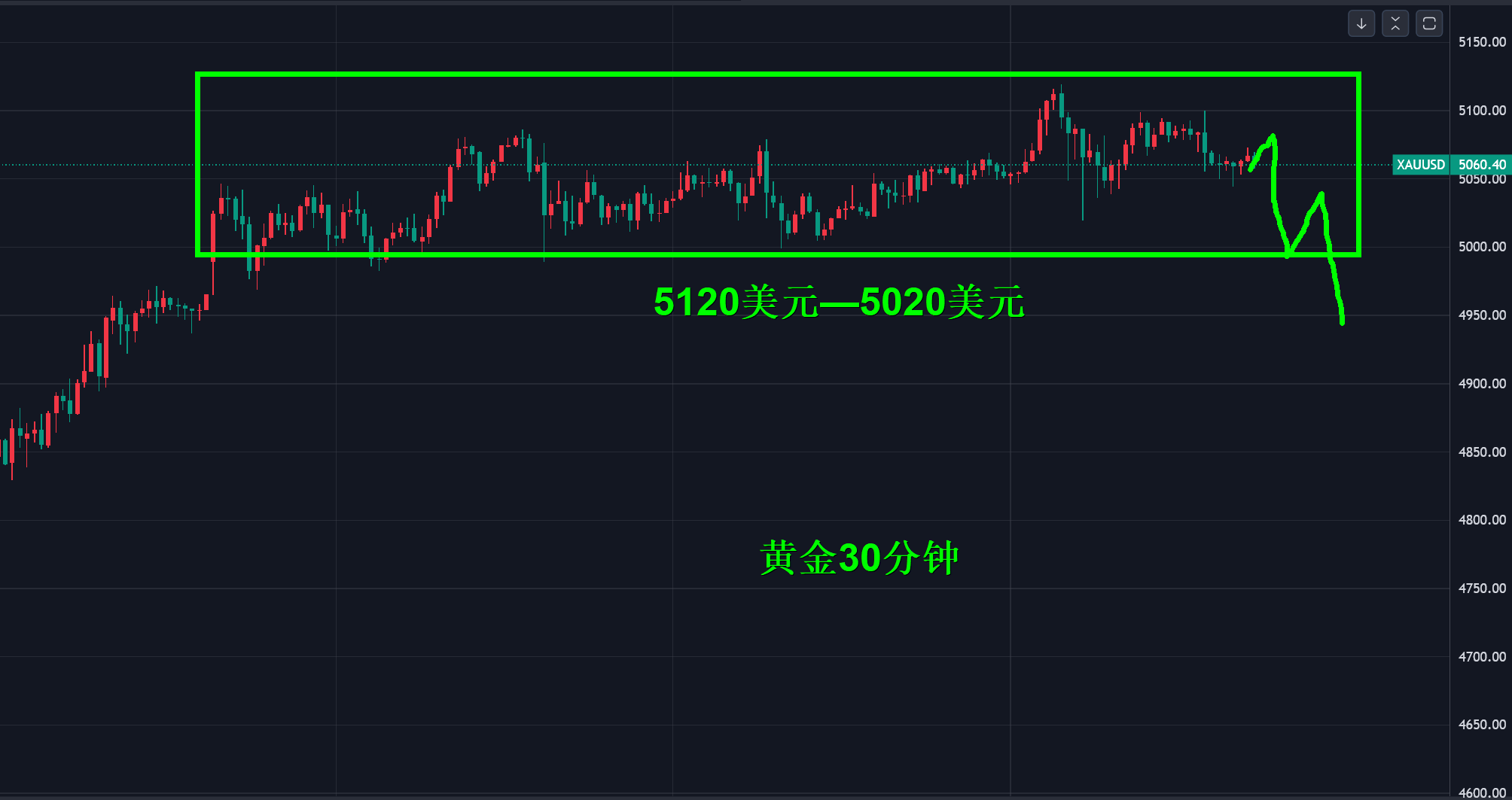 今天黄金以5120美元上方为防守点,逢高博回落,看多的可以在5050-30美元的区域参考多,打破区间后跟随即可,5120美元破位再回落多,计划随着行情而变,并非以不变应万变。