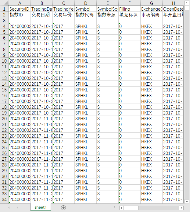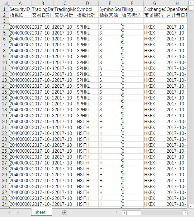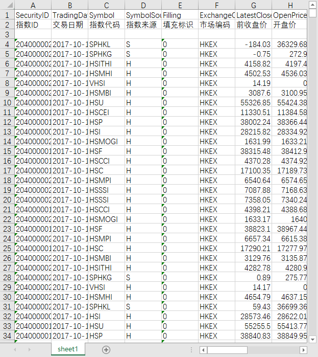 指数ID 交易日期 指数代码 指数来源 填充标识 市场编码 前收盘价 开盘价 最高价 最低价 收盘价 成交总量 成交总额 币种 涨跌 涨跌幅
