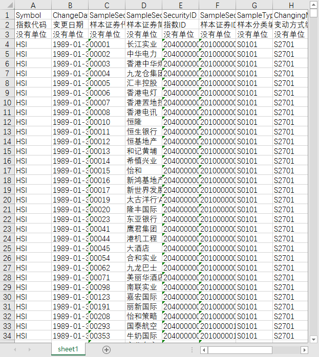 指数代码 交易日期 样本证券代码 股份英文名称 证券ID 样本证券ID 行业分类 收盘价 与上日比较跌升(%) 周息率(%) 市盈率(倍) 指数因子 影响指数升跌 分类市值比重(%) 占指数市值比重(%)