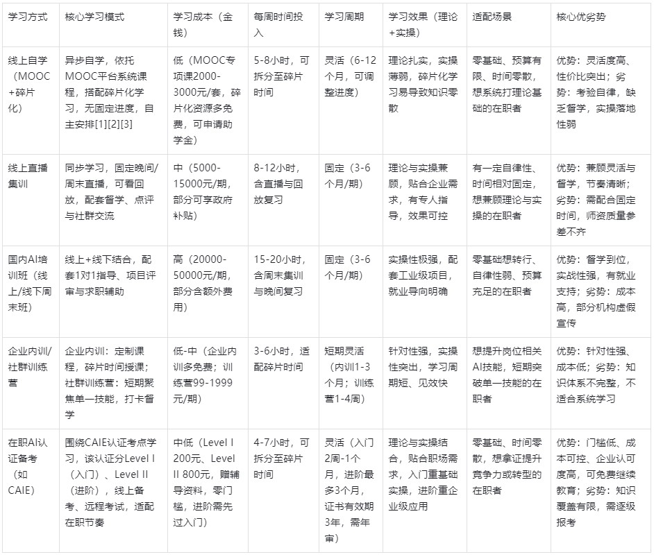 核心适配逻辑:零基础、预算有限、时间零散→线上自学+CAIE备考;时间中等、想兼顾理论实操→线上直播集训;想快速转行、预算充足→国内AI培训班;想岗位适配、短期突破→企业内训+社群训练营。
