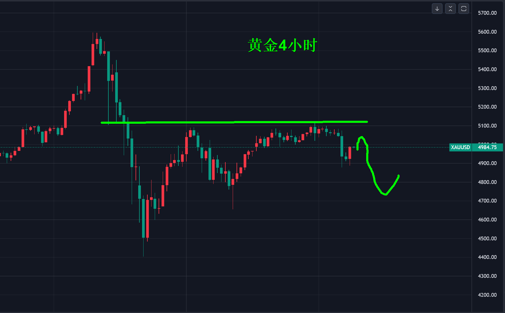 今天黄金反弹后做空为主,尤其早盘反弹的行情,随时关注后行14:00~15:00时间区别,这是跳水通用时间窗口,向下看到4870-4830-4800,极限在4750-4730美元。
