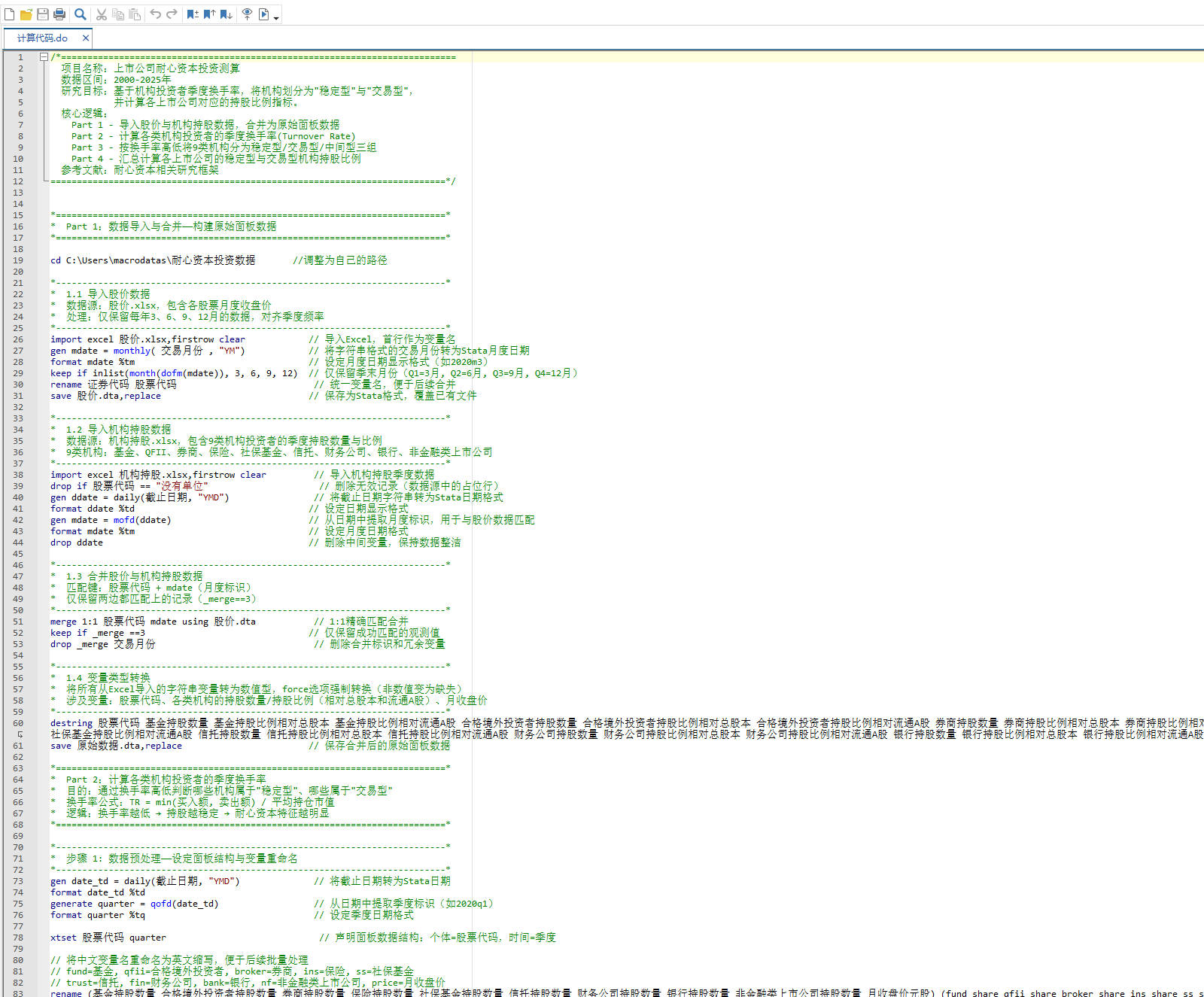计算代码.do —— Stata完整计算代码,包含数据导入、换手率计算、投资者分类、指标构建全流程