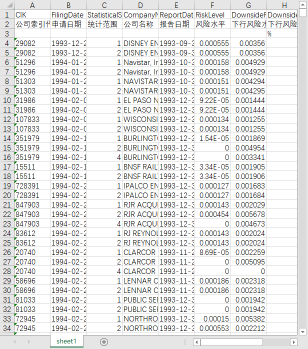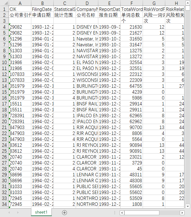 公司索引代码 申请日期 统计范围 公司名称 报告日期 单词总数 风险一词词频 风险相关词词频 下行风险词干词频 下行风险相关词词频 下行风险相关词的句子总数