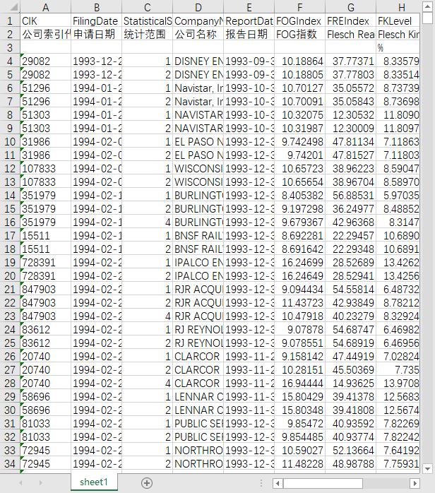 公司索引代码 申请日期 统计范围 公司名称 报告日期 FOG指数 Flesch Reading Ease指数 Flesch Kincaid等级水平 Coleman–Liau指数 Automated可读性指数 BOG指数