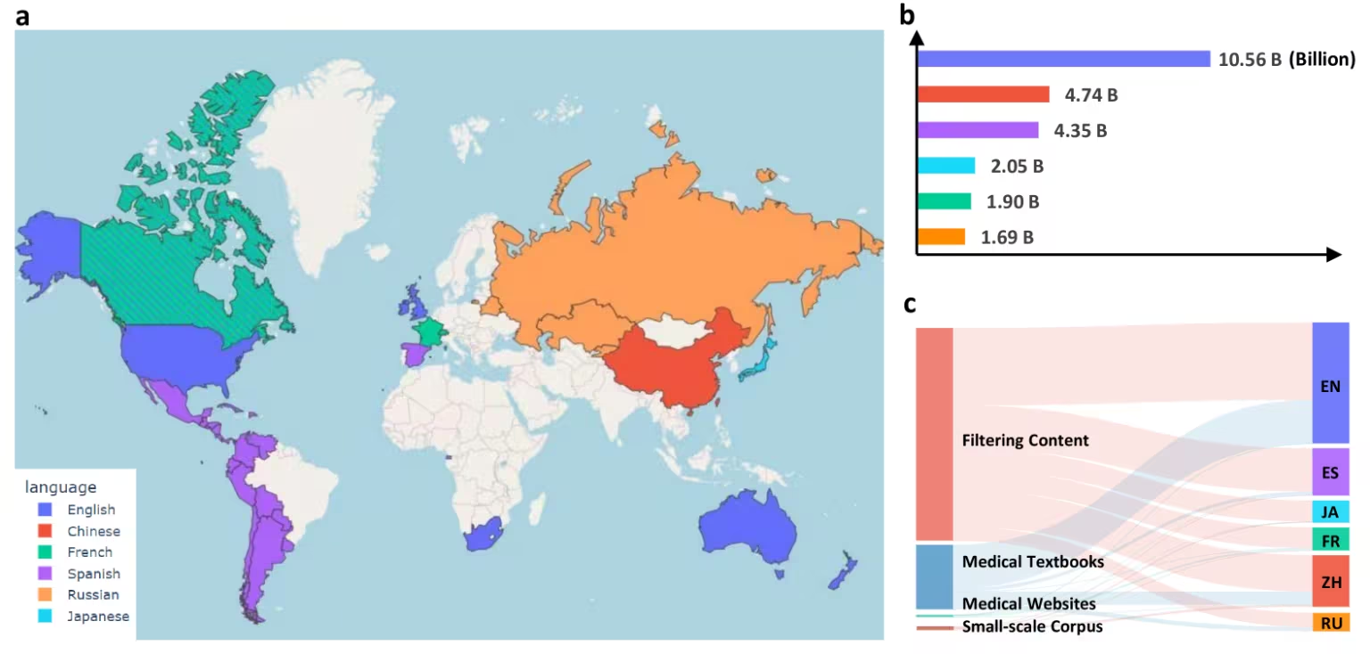 大规模多语医疗语料 (MMedC) 是一个由上海交通大学人工智能学院智慧医疗团队于 2024 年构建的多语言医疗语料库,它包含了约 255 亿个 tokens,涵盖了 6 种主要语言:英语、中文、日语、法语、俄语和西班牙语。这个数据集的构建是为了推动多语言医学大语言模型的发展,它覆盖了全球大部分地区,并且对更多语言的支持仍在不断更新和扩展中。相关论文成果为「Towards Building Multilingual Language Model for Medicine」,已发表于《nature communications》。