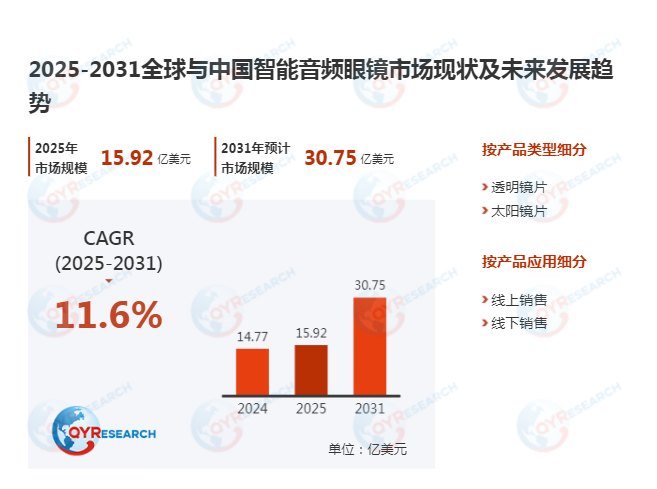 根据QYResearch最新调研报告显示,预计2032年全球智能音频眼镜市场规模将达到3396百万美元,未来几年年复合增长率CAGR为11.6%。