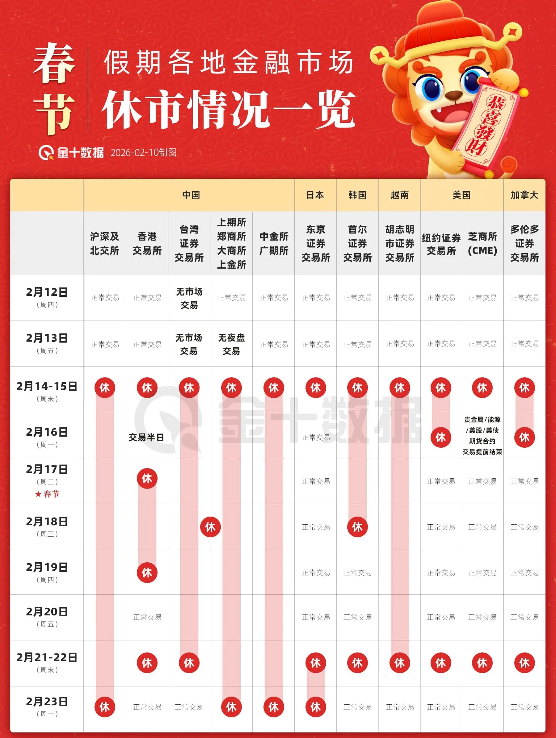 春节假期来临,台股市场率先休市,下周一,中国、韩国、越南、美国、加拿大等地金融市场都将迎来假期,敬请各位投资者留意。