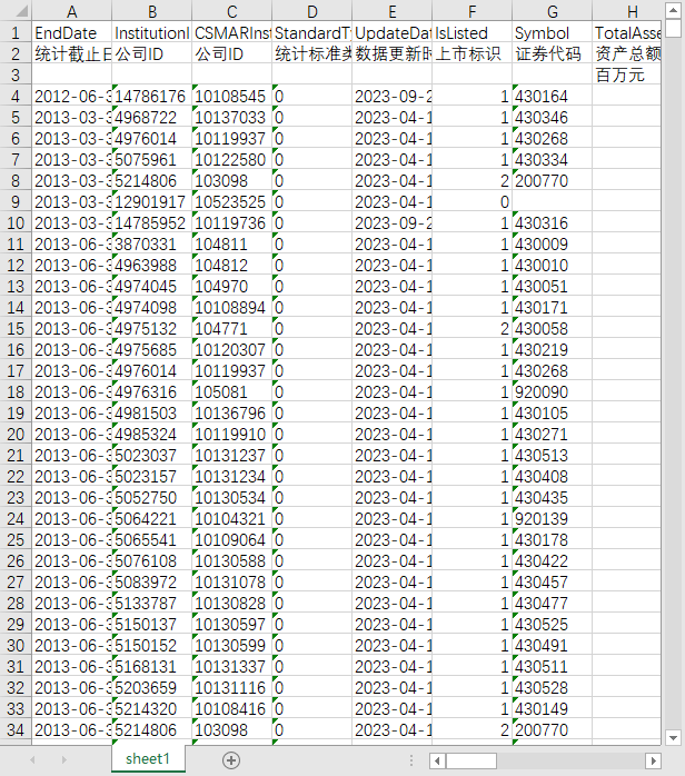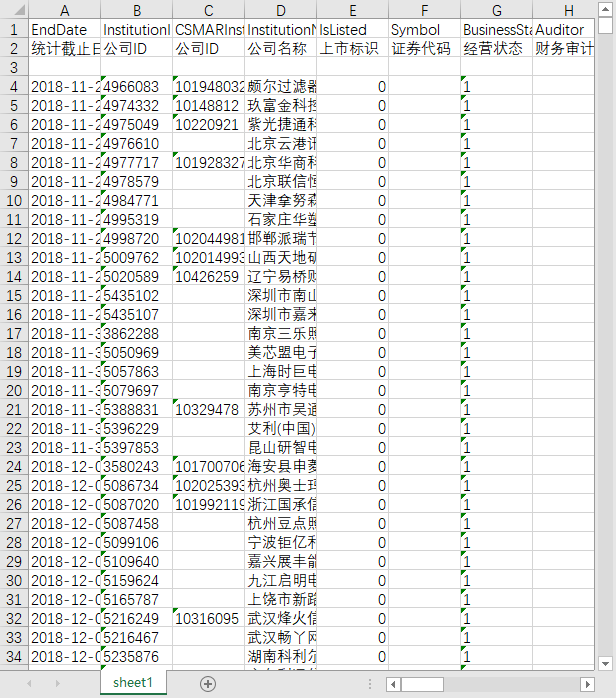 统计截止日期 公司ID 公司名称 上市标识 证券代码 经营状态 财务审计机构 财务审计机构统计时间 成立日期 注册资本 注册资本币种 注册资本统计时间 员工人数 员工人数统计类型 员工人数统计时间 所属行业门类-主营业务 所属行业代码-主营业务 所属行业名称-主营业务 所属行业门类-其他业务 所属行业代码-其他业务 所属行业名称-其他业务 主要产品 经营范围 公司登记注册类型 注册地址 所属省份 所属城市 ISIN编码