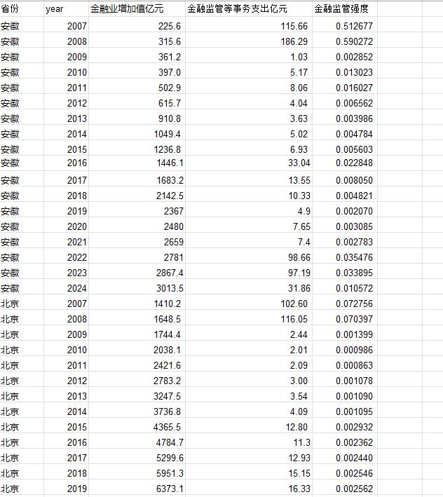 2007-2024年中国各省份金融监管强度数据整理(金融监管支出金融业增加值) .zip