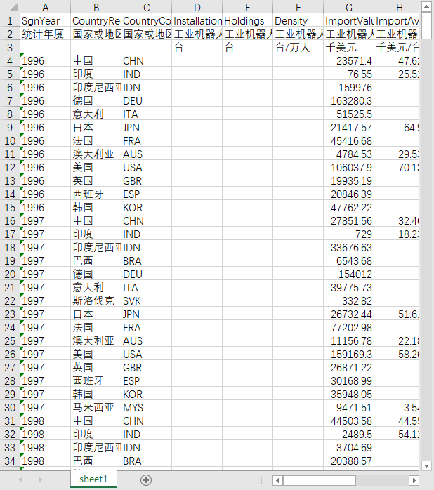 统计年度 国家或地区名称 国家或地区代码 工业机器人安装量 工业机器人保有量 工业机器人密度 工业机器人进口金额 工业机器人进口均价 工业机器人进口数量 工业机器人出口金额 工业机器人出口均价 工业机器人出口数量