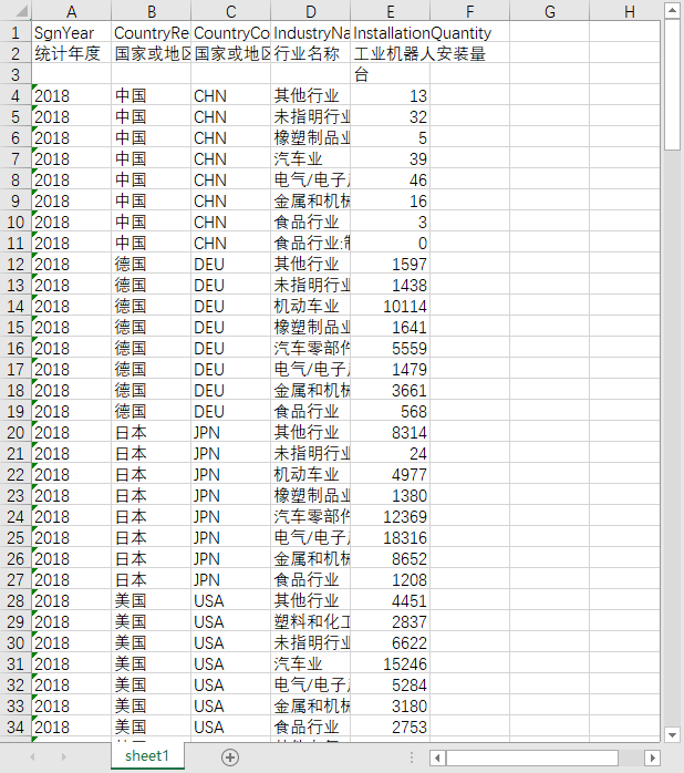 统计年度 国家或地区名称 国家或地区代码 行业名称 工业机器人安装量
