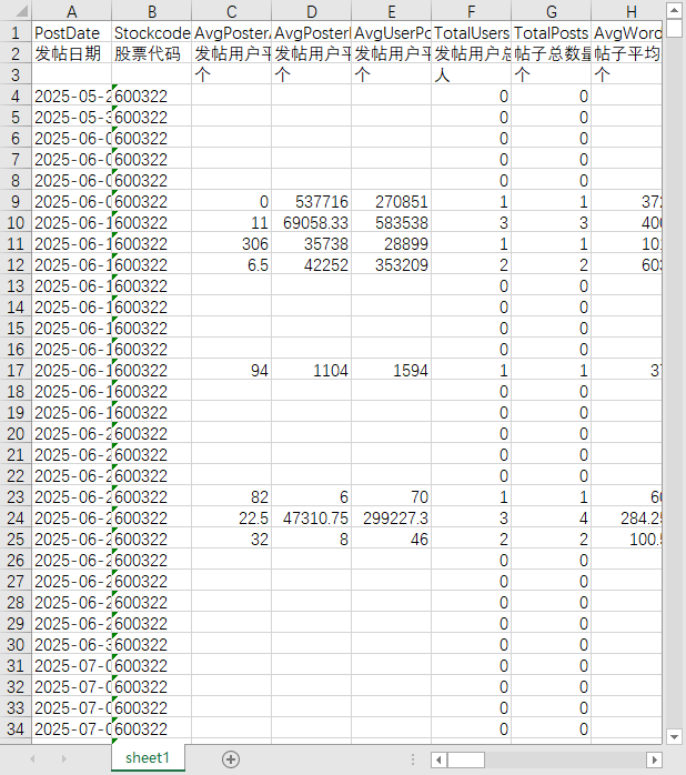 发帖日期 股票代码 发帖用户平均关注量 发帖用户平均粉丝量 发帖用户平均总发帖数 发帖用户总数 帖子总数量 帖子平均字数 帖子平均转发量 帖子平均评论量 帖子平均净评论量 帖子平均点赞量 发看跌帖用户平均总发帖数 发看跌帖用户总数 看跌帖子数量 看跌帖子平均转发量 看跌帖子平均评论量 看跌帖子平均净评论量 看跌帖子平均点赞量 发中立帖用户平均总发帖数 发中性帖用户总数 中立帖子数量 中立帖子平均转发量 中立帖子平均评论量 中立帖子平均净评论量 中立帖子平均点赞量 发看涨帖用户平均总发帖数 发看涨帖用户总数 看涨帖子数量 看涨帖子平均转发量 看涨帖子平均评论量 看涨帖子平均净评论量 看涨帖子平均点赞量 看涨情绪指数a 看涨情绪指数b 情绪一致性指数