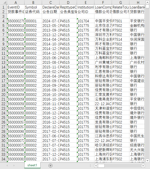 贷款事件ID 证券代码 公告日期 公告类型编码 公司ID 借款公司名称 借款公司与上市公司关系编码 贷款银行详情 是否银团 贷款银行 贷款银行数 银行所在地 是否签约 是否终止 贷款进程 签约日期 币种编码 币种 贷款金额上限 贷款金额下限 最新贷款金额 累计贷款金额 最近还款金额 最新还款日期 累计还款金额 贷款期限 续借期限 续借日期 贷款起始日期 贷款结束日期 逾期日期 逾期利率 逾期金额 基准利率 贷款利率 贷款浮动利率 贷款类型编码 是否有抵押质押物 资金投向 资金投向编码 公告内容 公告标题 披露情况 备注