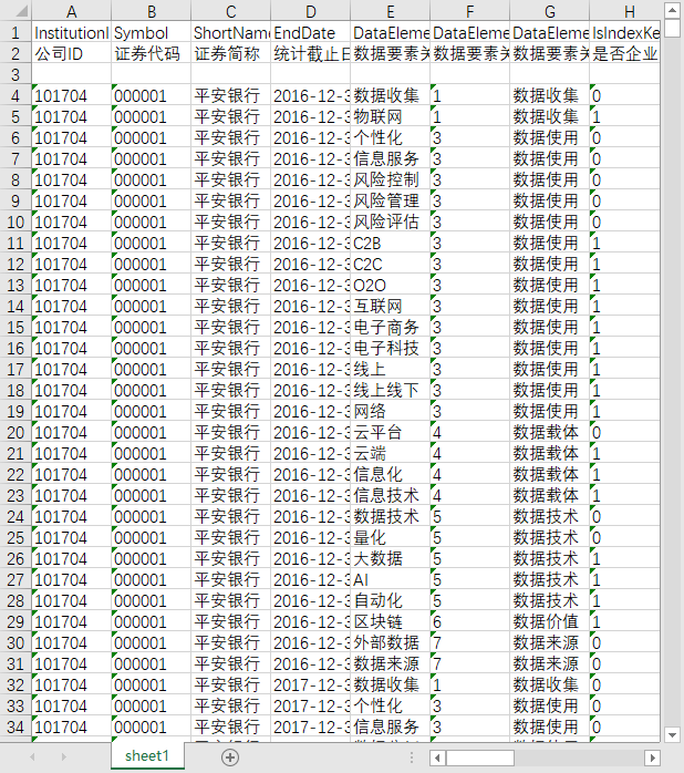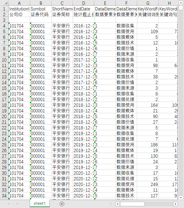 公司ID 证券代码 证券简称 统计截止日期 数据要素关键词类型编码 数据要素关键词类型 关键词词频统计 关键词句频统计 关键词所在句子字数 报告总字数 报告总词频 报告总句数 数据要素关键词总词频占比 数据要素关键词总句子数占比 数据要素关键词所在句子字数占比