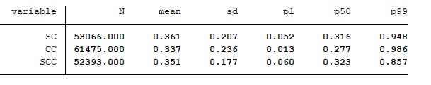 利用供应链集中度来衡量企业在供应链中的话语权,并将其细分为供应商话语权和客户话语权两个部分。具体地,SCC 为上市公司前五大供应商和前五大客户的采购与销售比例之和的均值,SC 为上市公司前五大供应商的采购额之和占企业当年总采购额的比例,CC 为上市公司前五大客户的销售额之和占企业当年总销售额的比例。值得注意的是,SCC、SC 和 CC 均为反向指标,数值越大表示企业对供应链、供应商和客户的依赖程度越大,在供应链中的话语权越小。