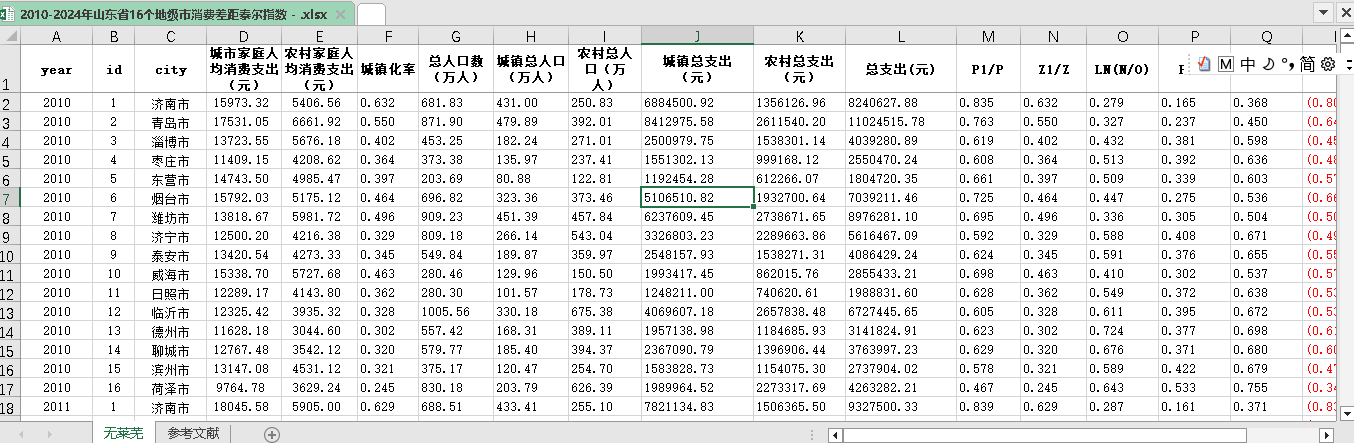 2010-2024年山东省16个地级市消费差距泰尔指数 - .xlsx