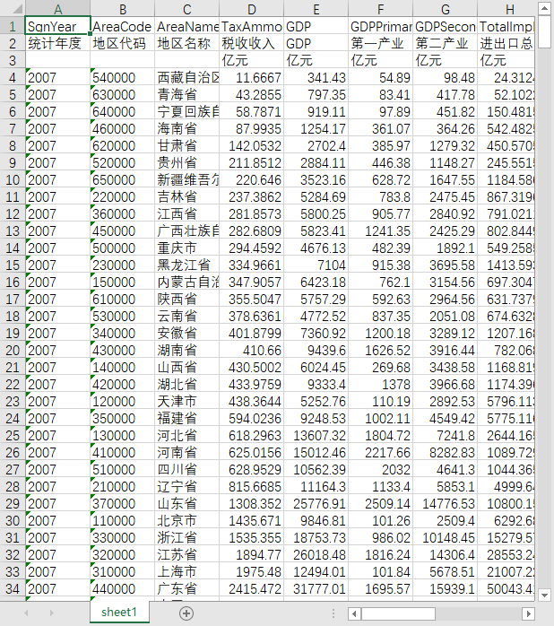 统计年度 地区代码 地区名称 税收收入 GDP 第一产业 第二产业 进出口总额 常数项β0 系数β1 系数β2 系数β3 残差ε 税收收入预测值 税收征管强度