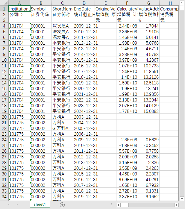 公司ID 证券代码 证券简称 统计截止日期 增值税-原文 增值税-计算 增值税负担率 消费税 消费税负担率 营业税 营业税负担率 关税 关税负担率 城市维护建设税 城市维护建设税负担率 教育费附加 教育费附加负担率 地方教育费附加 地方教育费附加负担率 教育费附加及地方教育费附加 教育费附加及地方教育费附加的加总负担率 资源税 资源税负担率 环境保护税 环境保护税负担率 土地增值税 土地增值税负担率 企业所得税 企业所得税负担率 房产税 车船税 土地使用税 印花税 房产税、车船税、土地使用税、印花税的合计 房产税、车船税、土地使用税、印花税的合计负担率 其它行政性收费和政府性基金-境内 其它行政性收费和政府性基金负担率-境内 其它行政性收费和政府性基金-境外 其它行政性收费和政府性基金负担率-境外 收到的税费返还额 总的税费负担率合计 增值税优惠 企业所得税优惠 其它税收优惠 社会保险费 社会保险费负担率