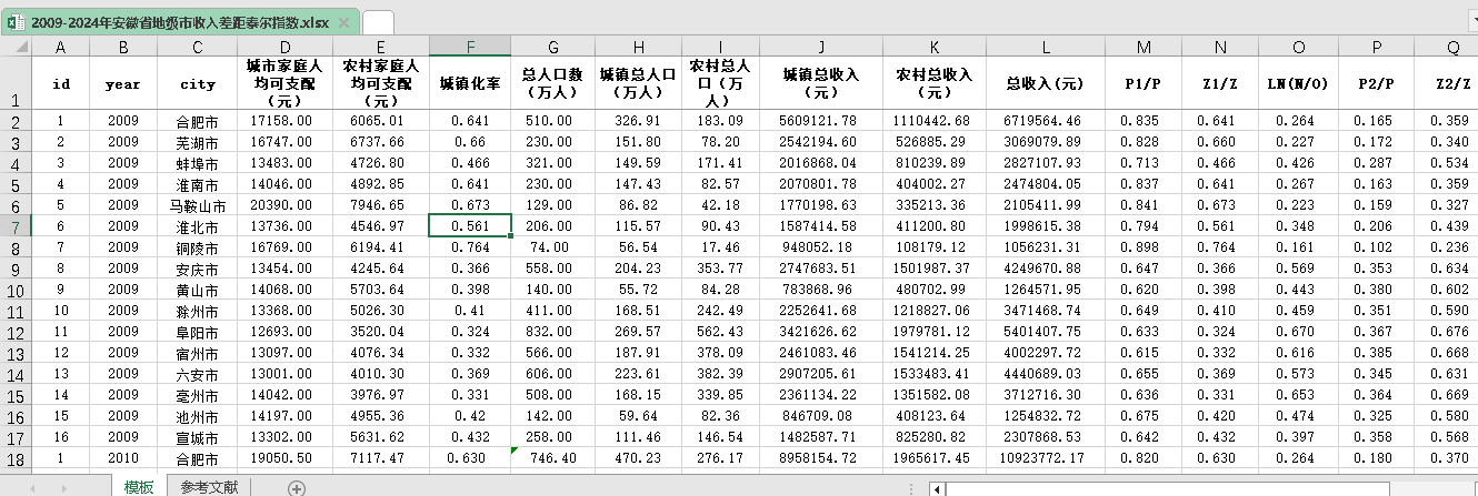 2009-2024年安徽省地级市收入差距泰尔指数.xlsx
