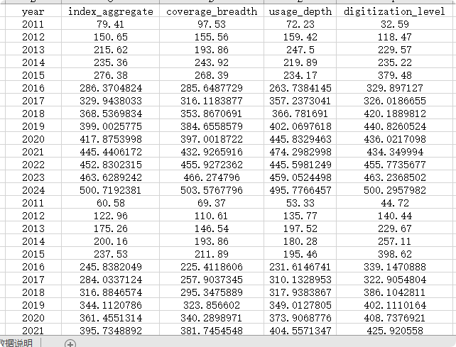 (1)index_aggregate(数字普惠金融总指数):综合反映一个地区数字普惠金融的整体发展水平,是覆盖广度、使用深度和数字化程度三个一级维度的加权汇总结果。数值越高,表明该地区数字普惠金融发展水平越高。