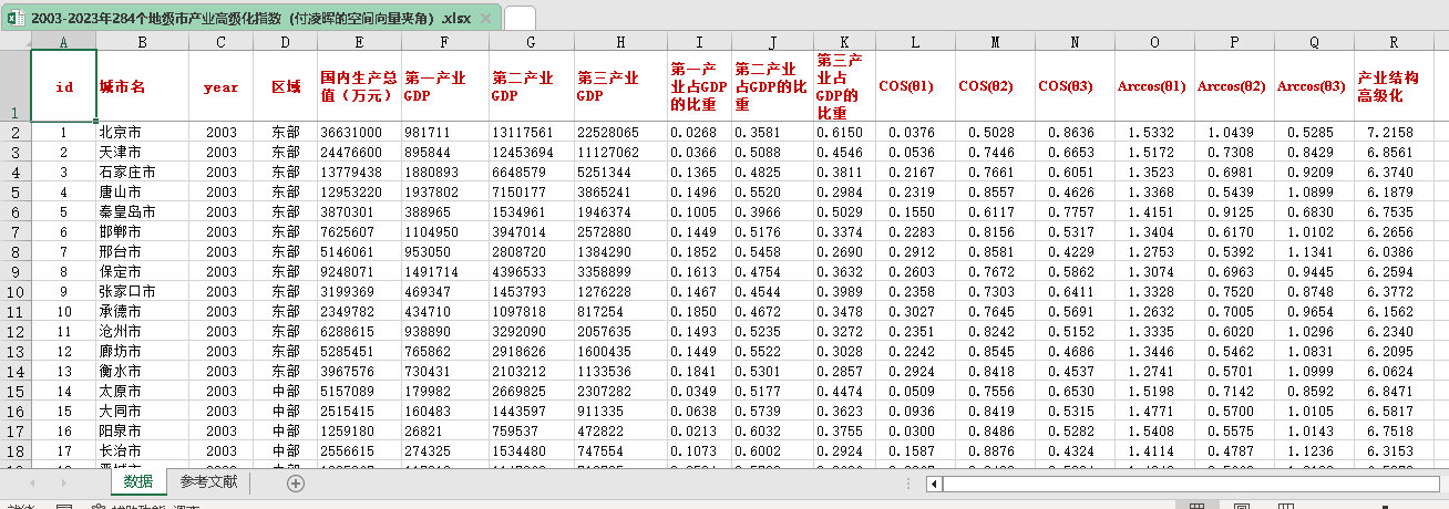 2003-2023年284个地级市产业高级化指数(付凌晖的空间向量夹角).xlsx