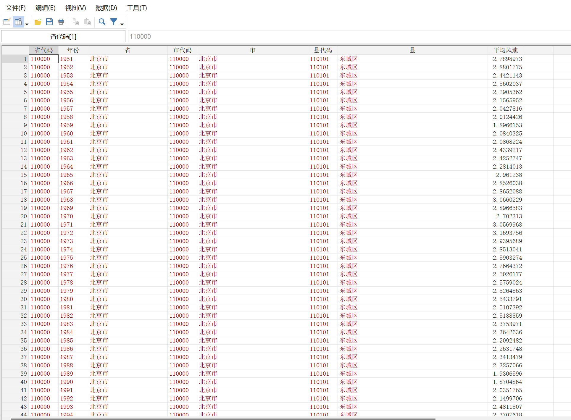 本分享数据包含中国各区县的平均风速数据,涵盖了1951年至2024年之间共21w+条数据,数据按年度进行整理