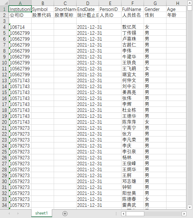 公司ID 股票代码 股票简称 统计截止日期 人员ID 人员姓名 性别 年龄 最高学历ID 最高学历 职务ID 职务名称 任职开始日期 任职结束日期 年末是否在职 离职原因 期末持股数 是否在股东单位任职 任职股东单位名称 在股东单位担任职务 个人简历