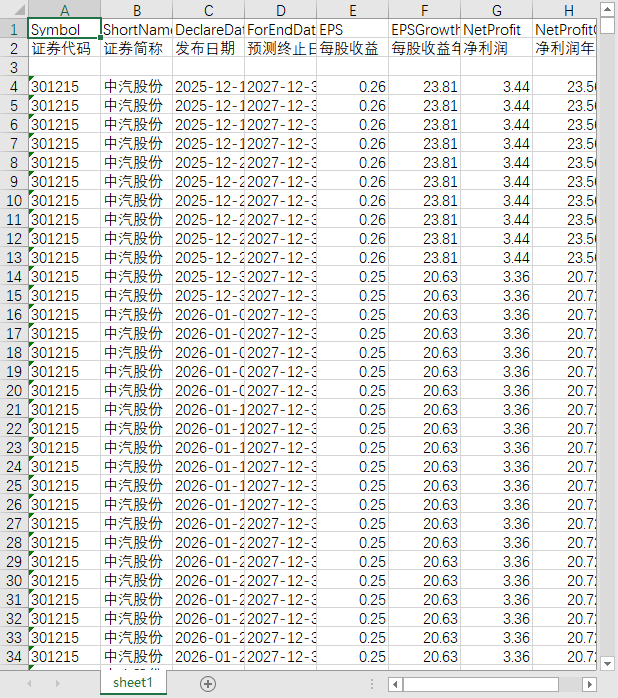 | 证券代码 | 证券简称 | 发布日期 | 预测终止日 | 每股收益 | 每股收益年增长率 | 净利润 | 净利润年增长率