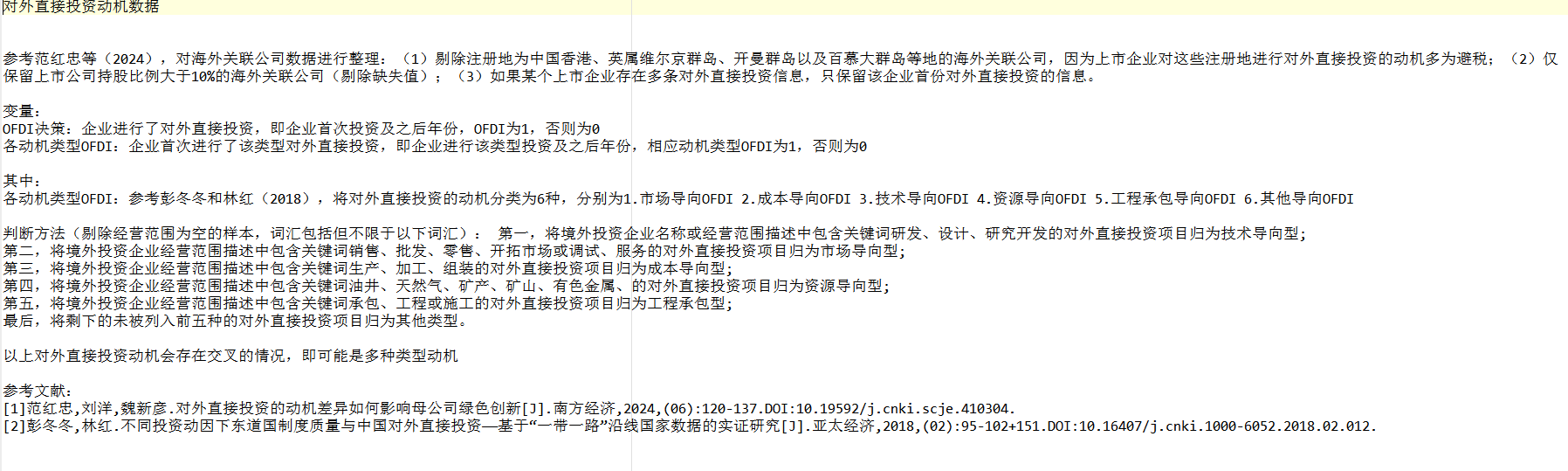 参考相关文献对对外直接投资动机的划分及处理方式,通过对上市企业海外关联公司的经营范围进行人工识别,整理得到企业的6种投资动机,具体数据处理方法及结果示例详见附图: