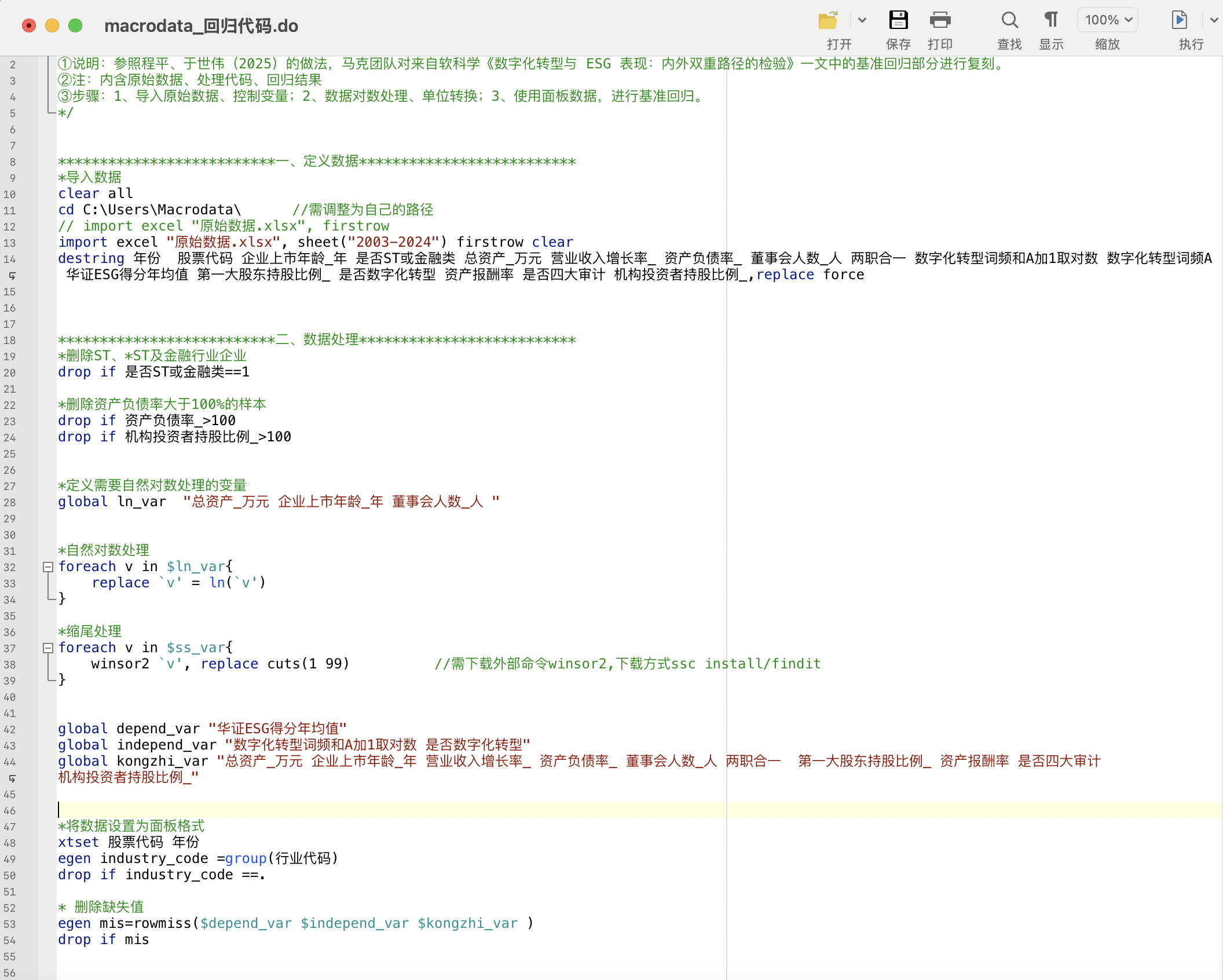 参照程平、于世伟(2025)的做法,对《数字化转型与ESG表现:内外双重路径的检验》一文中的基准回归部分进行复刻;本次使用2003-2024年我国A股上市公司面板数据,通过实证回归,考察和分析数字化转型对企业ESG表现的影响。研究证实,数字化转型对企业 ESG表现具有显著的提升作用。这一结论不仅为企业可持续发展路径提供了实证依据,更为那些在数字化转型门槛前犹豫观望的企业注入了关键信心。