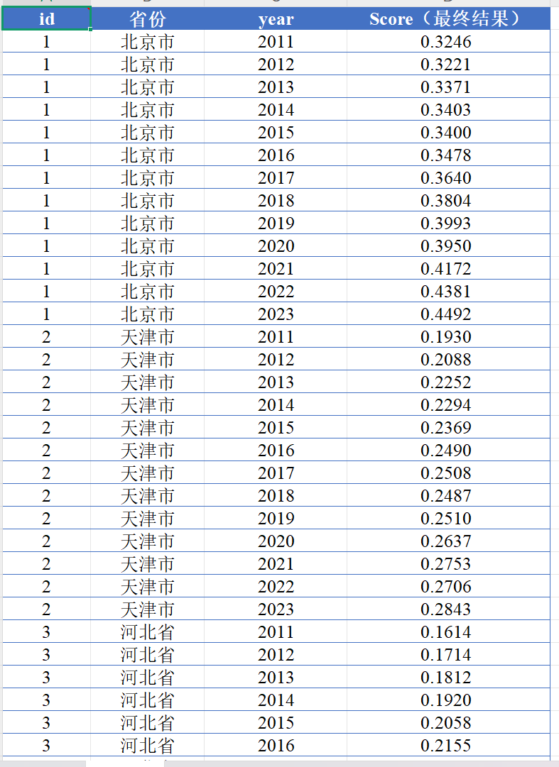 参考韩亮亮等(2023)的做法,结合共同富裕的发展性、共享性与可持续性,从收入、教育、医疗、生态等多个维度建立指标评价体系,并运用熵值法科学赋权,客观衡量全国31个省份2011-2023年共同富裕发展水平,从而反映各省共同富裕的进展和差距,本次分享数据包含计算代码、原始数据、最终结果