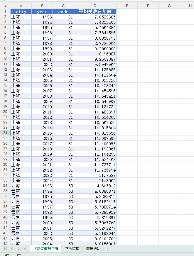 一、数据简介:本次数据为各省平均受教育年限与学历结构数据,其数据来源为中国统计年鉴,计算方式为平均受教育年限=(小学学历人数*6+初中学历人数*9+高中和中专学历人数*12+大专及本科以上学历人数*16)/6岁以上人口总数;学历结构=大专及本科以上学历人数/6岁以上人口总数。基于中国各省平均受教育年限与学历结构数据,可展开多维度关联性与应用性研究:一是区域教育发展差异研究,对比东中西部、南北方各省数据,分析教育资源分配不均衡的表现、成因及演化趋势,探究经济发展水平与教育发展的相互作用机制;二是学历结构与平均受教育年限的协同演进研究,分析各省不同学历层次(小学、初中、高中、大专及以上)人口占比与平均受教育年限的匹配度,研判教育普及政策的实施成效;三是与社会经济指标的关联性研究,探究两省数据与人均GDP、产业结构、就业率、人口老龄化等指标的相关性,揭示教育对区域经济发展、产业转型升级的支撑作用及滞后效应;四是教育公平与优化路径研究,聚焦各省内部城乡、性别间的教育差距,结合数据提出针对性的教育资源均衡配置建议;五是人才供给与需求适配性研究,结合各省产业布局,分析学历结构是否契合区域人才需求,为各省教育规划、人才引进政策制定提供数据支撑,助力区域教育与经济社会协同发展。