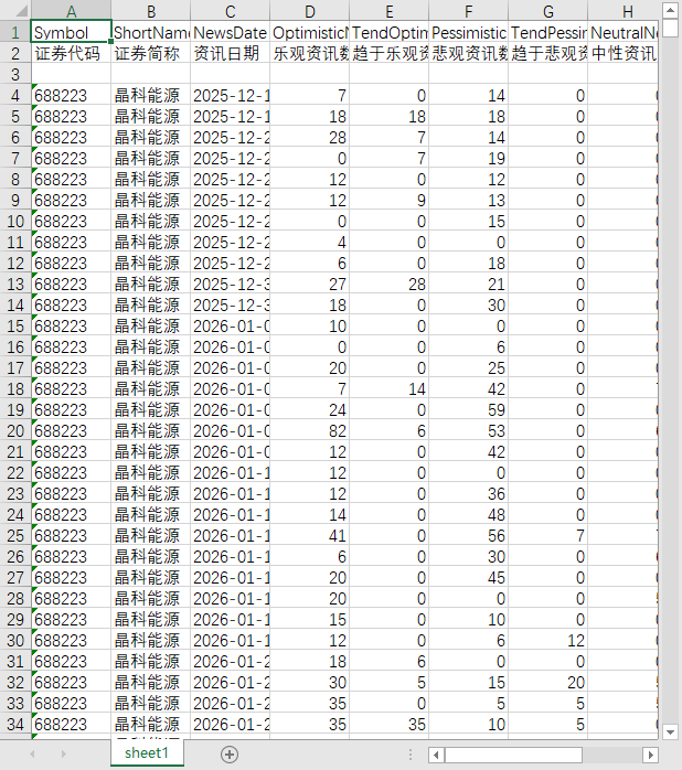 证券代码 证券简称 资讯日期 乐观资讯数量 趋于乐观资讯数量 悲观资讯数量 趋于悲观资讯数量 中性资讯数量 综合市场情绪1 综合市场情绪2