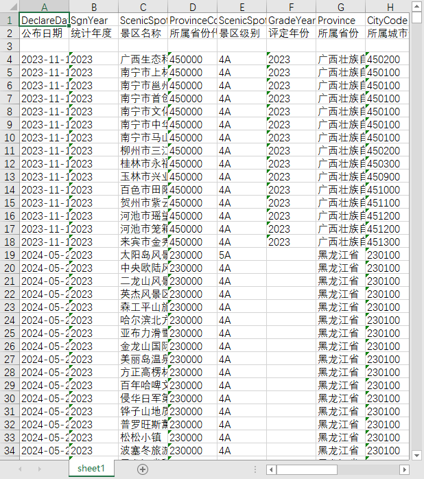 公布日期 统计年度 景区名称 所属省份代码 景区级别 评定年份 所属省份 所属城市代码 所属城市 所属县域代码 所属县域 景区地址 经度 纬度