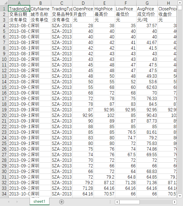 交易日期 城市名称 交易品种简称 开盘价 最高价 最低价 成交均价 收盘价 总成交量 总成交额 涨跌幅(%) 前收盘价 挂牌协议成交量 挂牌协议成交额 大宗协议成交量 大宗协议成交额 单项竞价成交量 单项竞价成交额