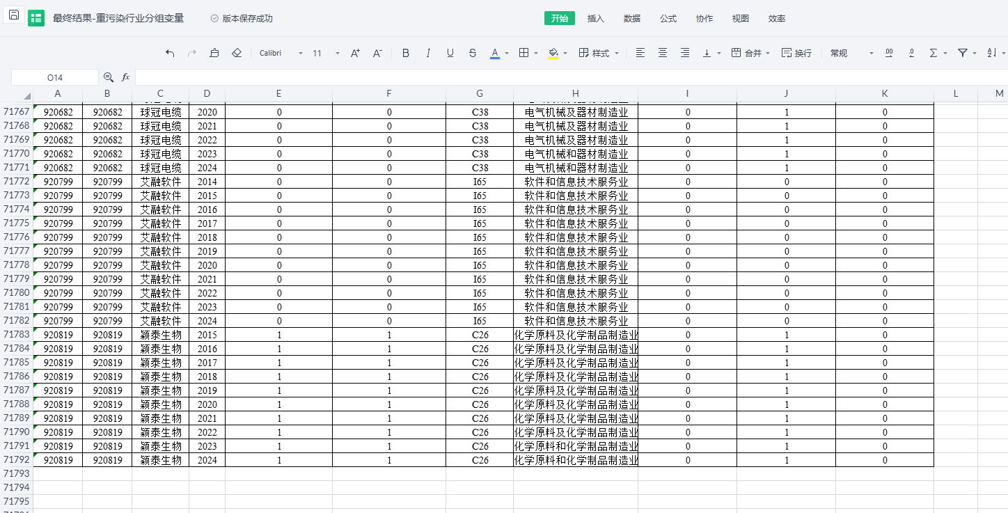 包含指标:企业代码 企业代码 股票简称 年份 重污染行业分组变量1(1是;0否) 重污染行业分组变量2(1是;0否) 行业代码 行业名称 金融业为1,否则为0 制造业为1,否则为0 ST或PT为1,否则为0