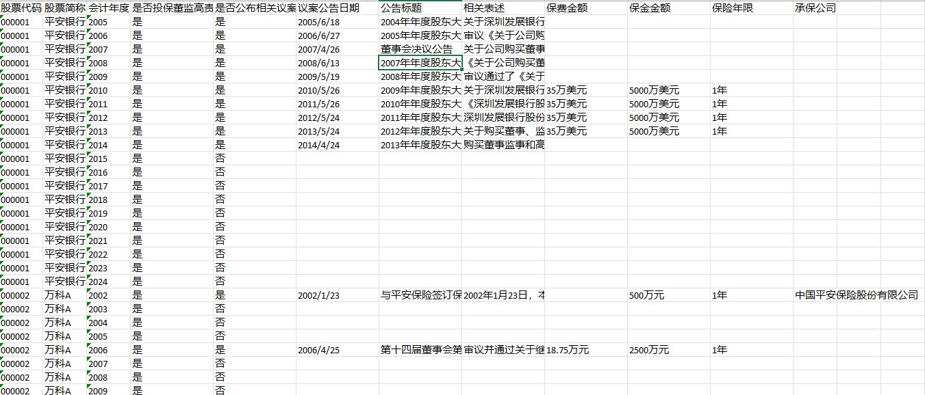 | 是否投保董监高责任保险 | 上市公司是否投保董监高责任保险,该字段数值全部为“是” |