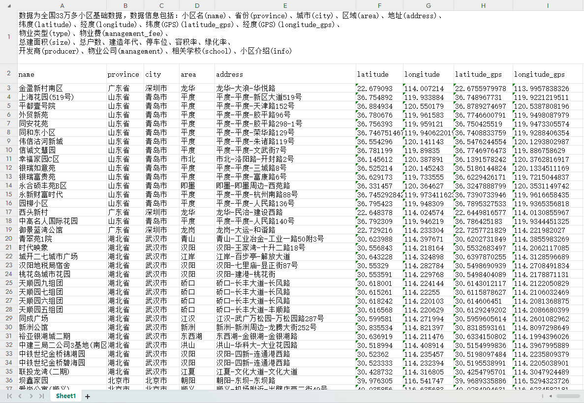 本数据提供了一份详尽的全国小区数据资源文件,涵盖了33万多个小区的详细信息。该数据集包含了小区名、 所属省份、城市、 区域、详细地址、 纬度、经度、 GPS 纬度、 GPS 经度、物业类型、 物业费、 总建筑面积、 总户数、 建造年代、停车位数量、 容积率、绿化率、 开发商名称、物业公司名称等关键信息。