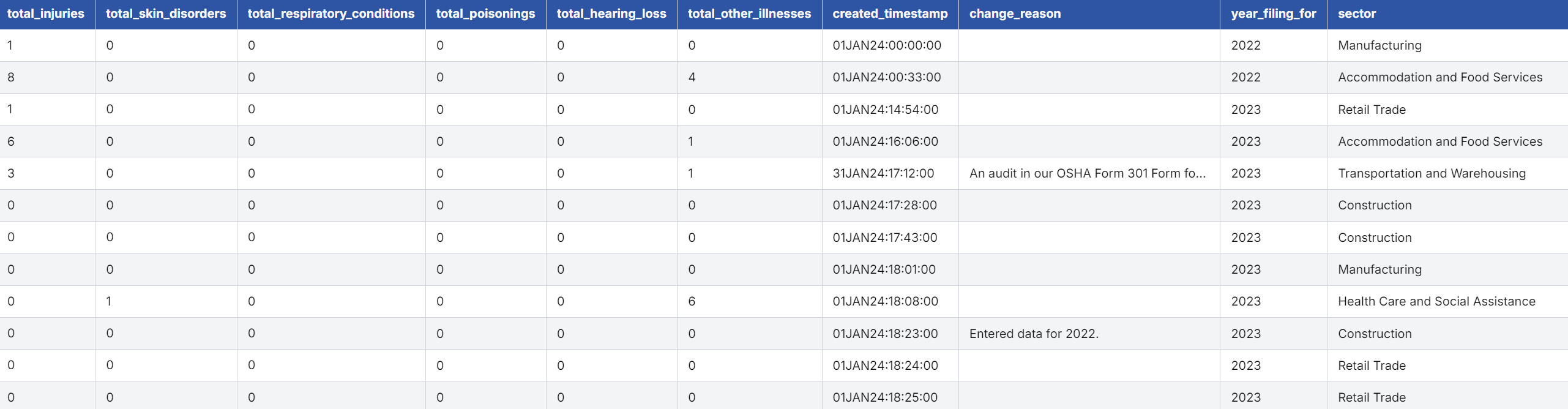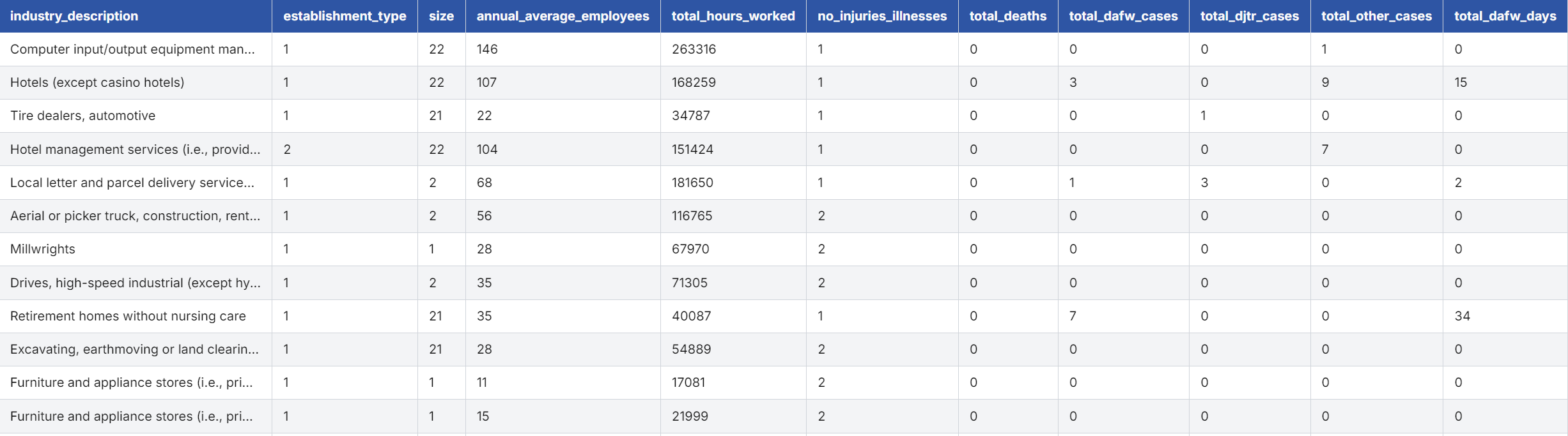 收集的,旨在追踪与工作相关的伤害和疾病数据。数据来源于OSHA表格300A:与工作相关的伤害和疾病摘要,涵盖了2016年至2023年间各个行业的相关数据。通过收集机构摘要数据,ITA数据为行业、研究机构和政策制定者提供了关于工作场所安全和健康的重要见解。