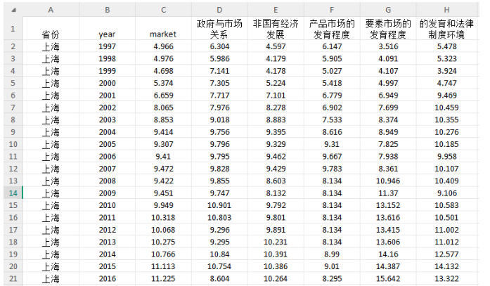 中国分省份市场化指数(简称“市场化指数”)是一个用指数形式衡量全国各省、自治区和直辖市市场化相对进程的指数体系,目前涵盖了全国31个省、自治区、直辖市(以下简称“省份”)在1997—2019年这22年的市场化相对进程总体评分及排序、各方面指数和分项指数评分及排序(西藏个别年份数据暂缺)。
