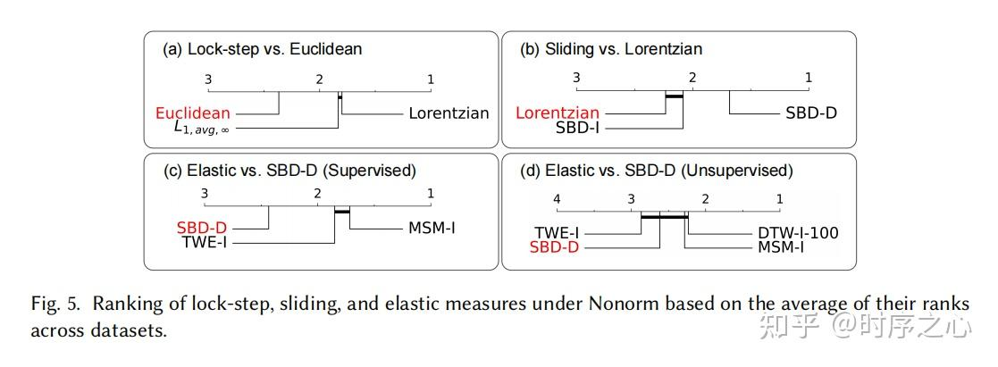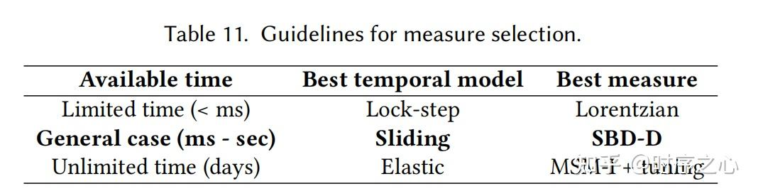 - 弹性度量处理局部时间失真的能力并不总能保证带来比滑动度量更好的性能,尤其是在缺乏监督信号进行参数调优时。