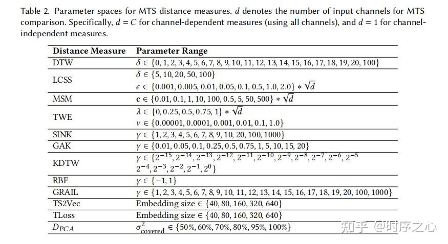 参数化:为确保公平性,对需要参数的度量(如弹性、核度量等)进行了系统的参数调优,覆盖了监督(在训练集上交叉验证)和无监督(选择一个在所有数据集上表现普遍良好的默认值)两种设置。(参考表2)
