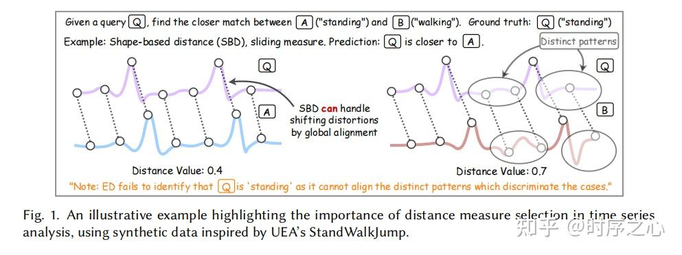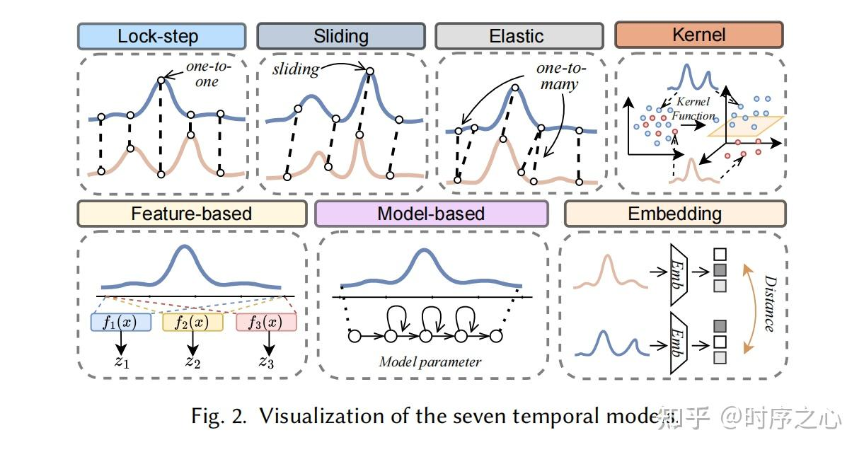 - 时间模型 (Temporal Model):定义了度量如何处理时间维度上的失真,是度量方法的核心分类依据(如锁步、滑动、弹性等)。(参考图2)