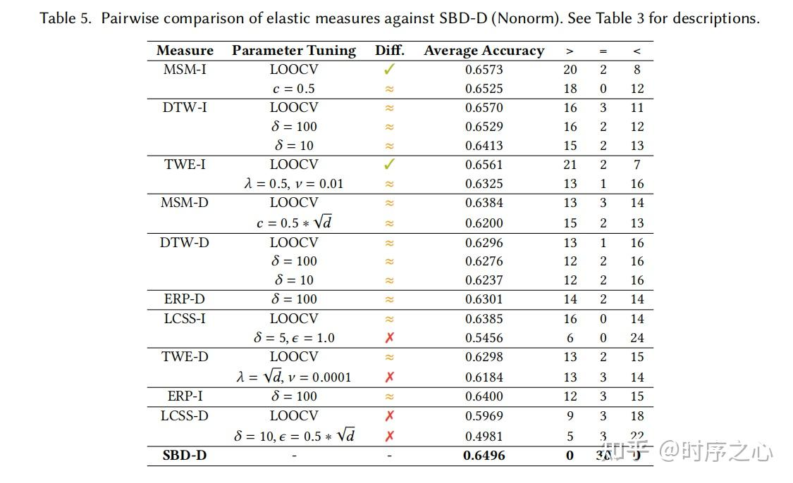 - 结果表明,弹性度量的性能高度依赖于参数选择,而参数无关的SBD-D已经具备极强的竞争力。