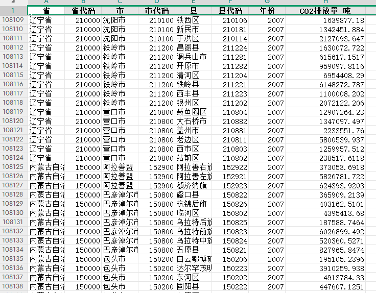 年份、省份、市、市代码、县、县代码、二氧化碳排放总量