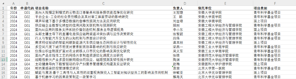 本清单一共有1000多个记录,主要统计自各校相关院系发布的2024年获批结果和各位项目负责人的CV,统计项包括学科代码(仅作参考)、项目批准号、单位、负责人、项目名称、项目类型。