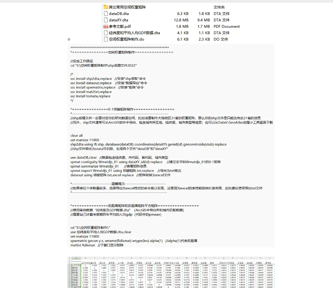 如何自主生成空间权重矩阵?可根据自己对需求生成权重矩阵(根据ArcGIS中导出的省份数据和经纬度数据),包含案例数据和Stata代码