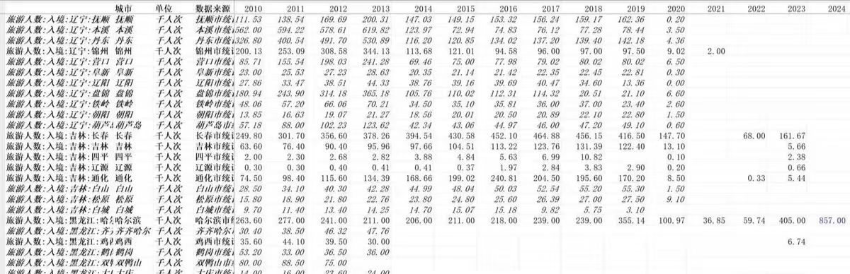 商品1:297个地级市入境旅游人次1999-2024年,99-04年缺失22-55个间,05-07年缺10-15个,08-13年每年缺失13个以下,14-19年缺失46-58个,20年缺76个,21-23年缺失190-197个、24年缺227个(提醒童鞋们yiqing后入境人次可忽略不计,太少几乎不统计更新)。